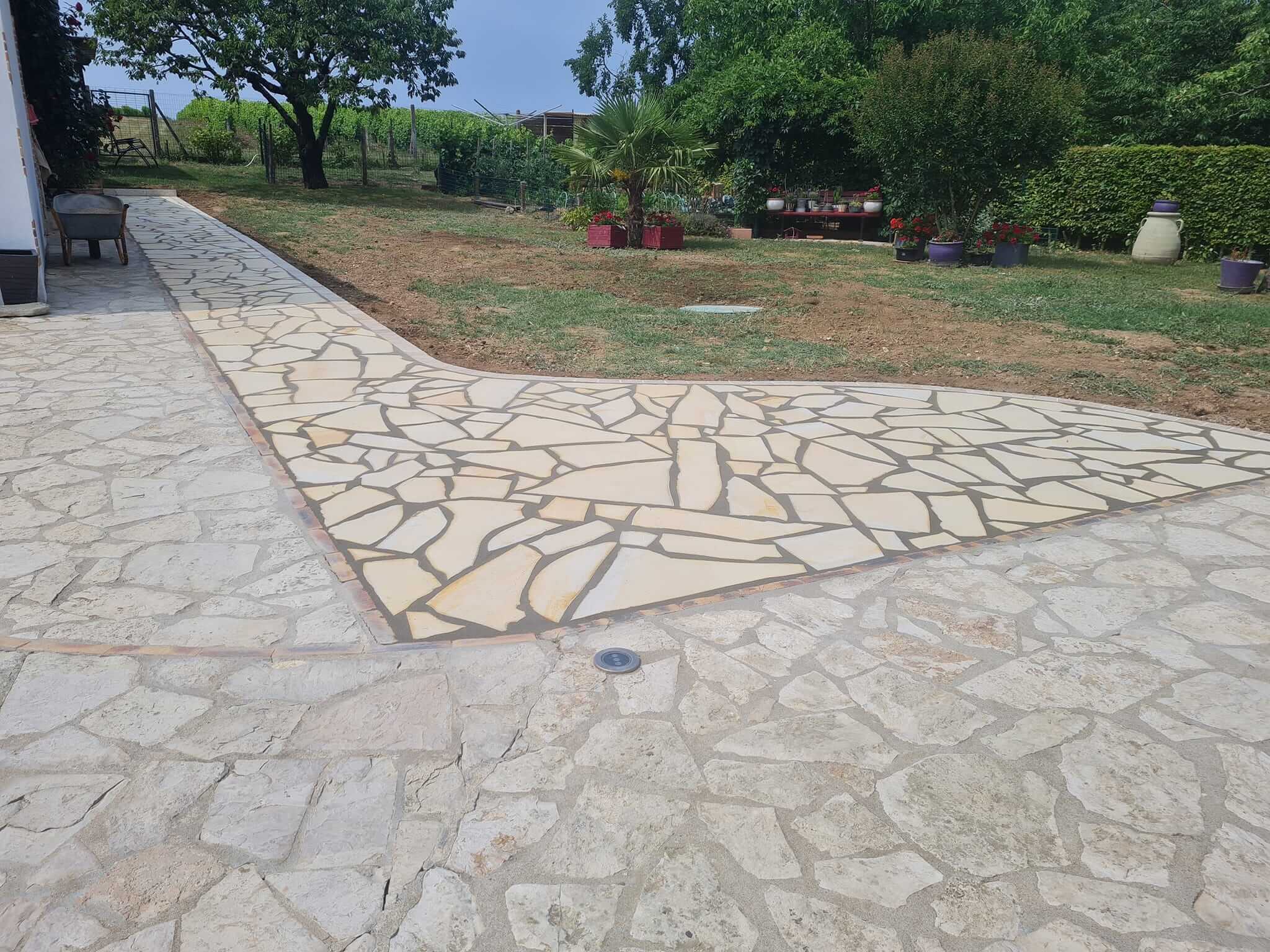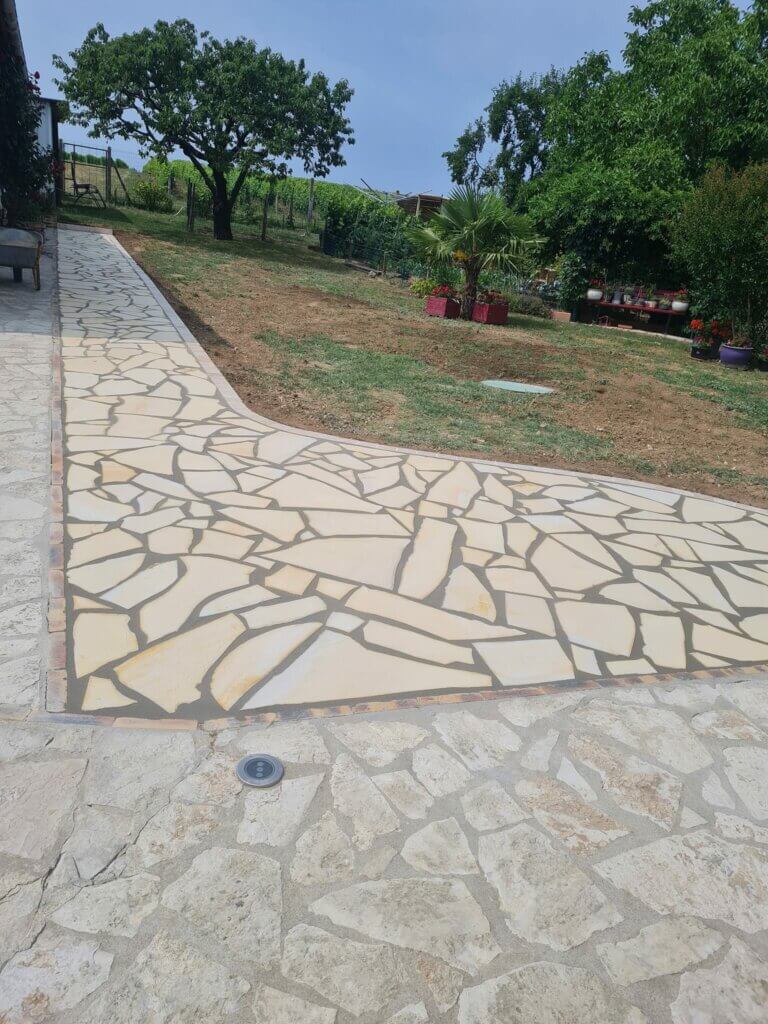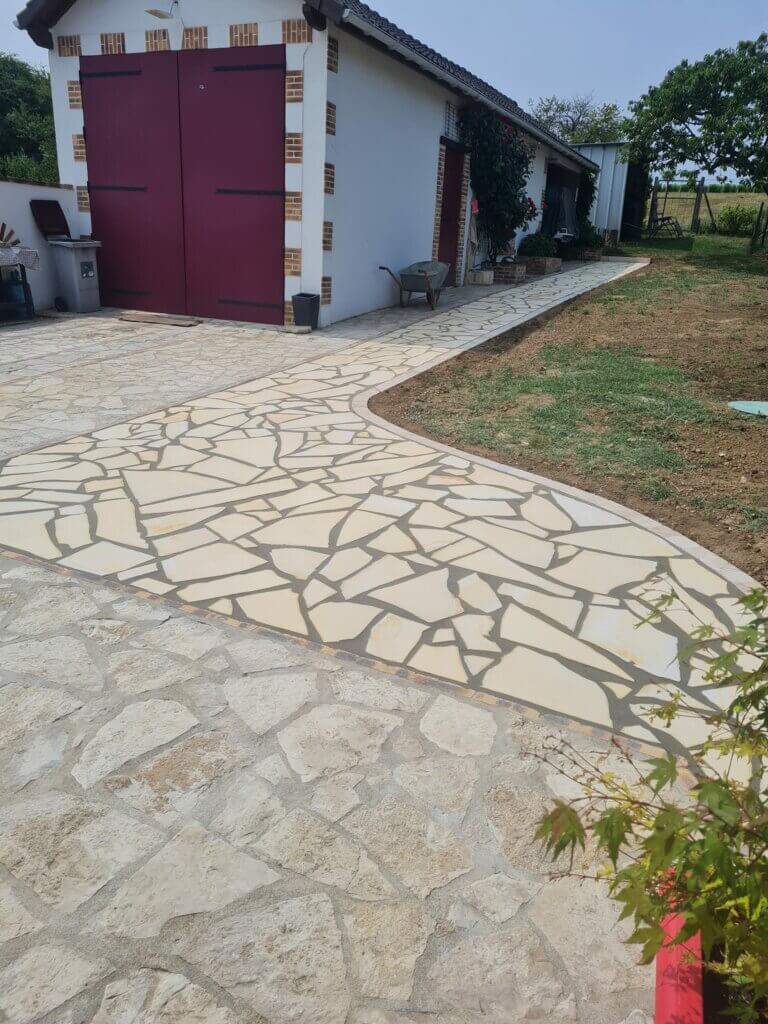 Cette allée a bénéficié d’un élargissement élégant, alliant authenticité et fonctionnalité. Le choix d’un opus incertum en pierre de Bavière apporte un charme naturel et des nuances chaleureuses, tandis que les bordures en pavé travertin viennent structurer l’ensemble avec raffinement.
