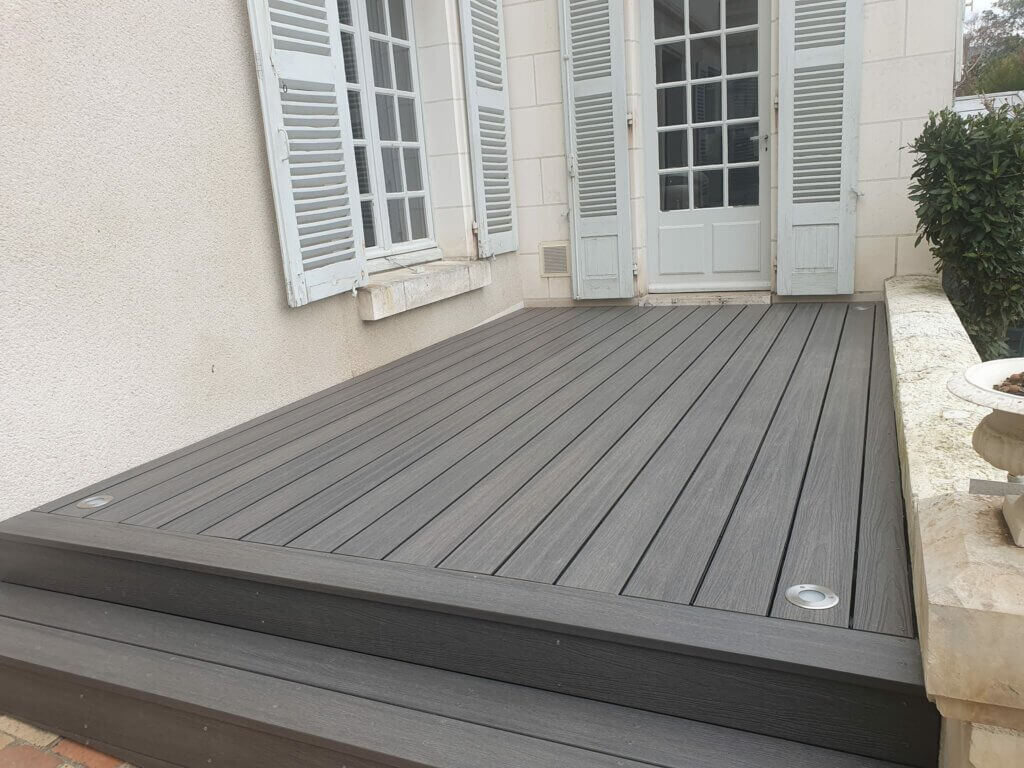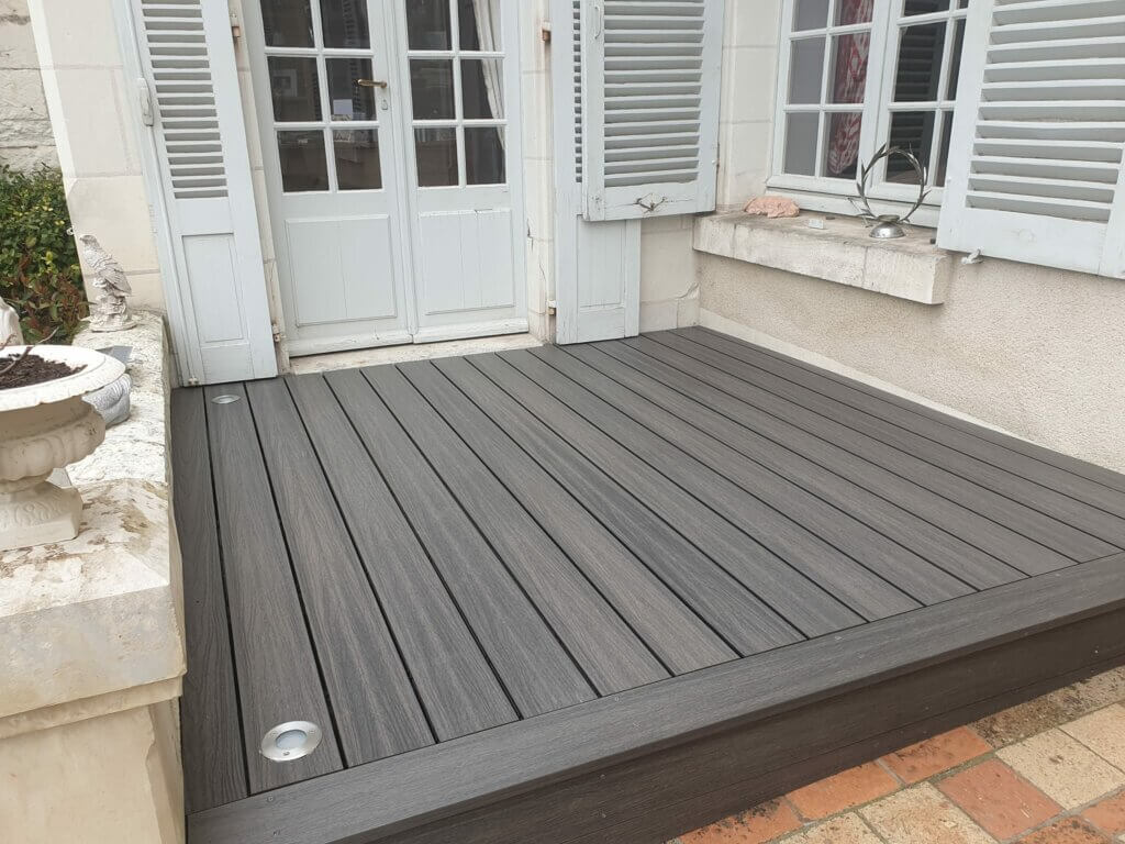 Une réalisation à la fois sobre et élégante : deux terrasses en lames composites viennent ici s’intégrer parfaitement devant les ouvertures de la maison. Leur niveau rehaussé permet de gommer la marche initiale et d’assurer une continuité naturelle entre l’intérieur et l’extérieur.
