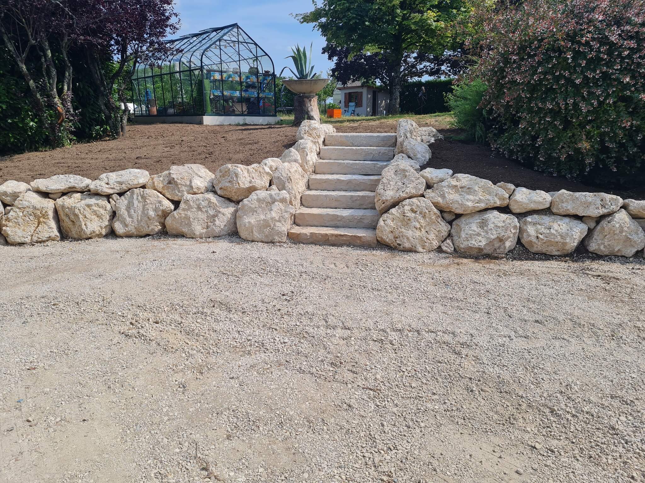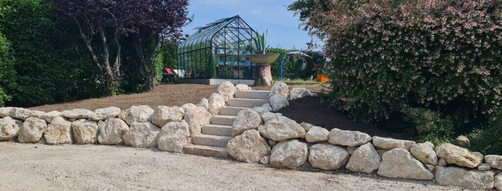 L’enrochement apporte du relief, du caractère et une véritable identité au jardin. Réalisé ici en blocs naturels de travertin, il s’intègre parfaitement à l’environnement tout en assurant une excellente stabilité du terrain. Les pierres, choisies une à une pour leur teinte et leur texture, forment une structure harmonieuse et durable, aussi esthétique que fonctionnelle.